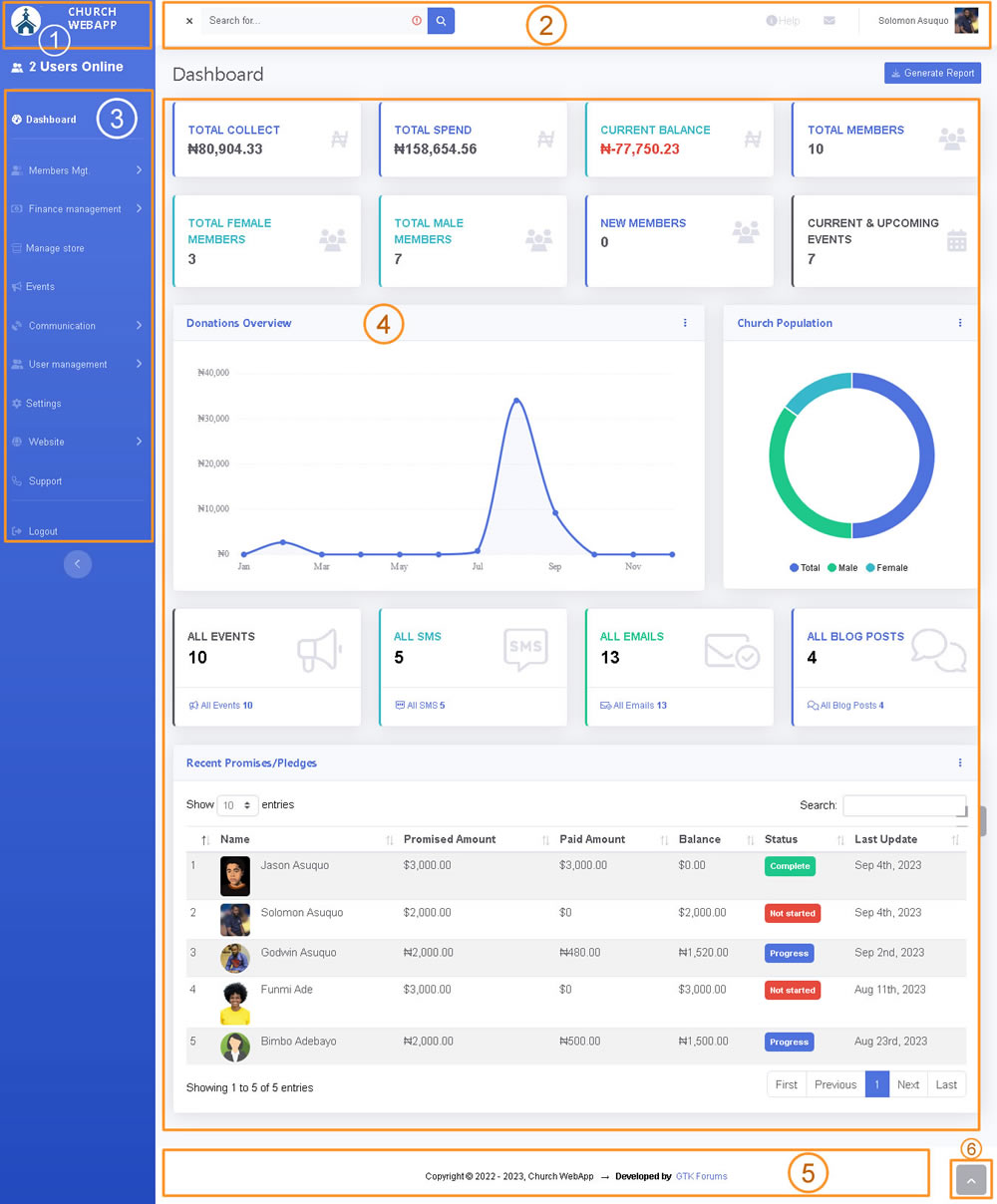 Recent Promises/Pledges: Displays some of the pledges made within the ministry. You will be able to view this if you're logged in as admin.