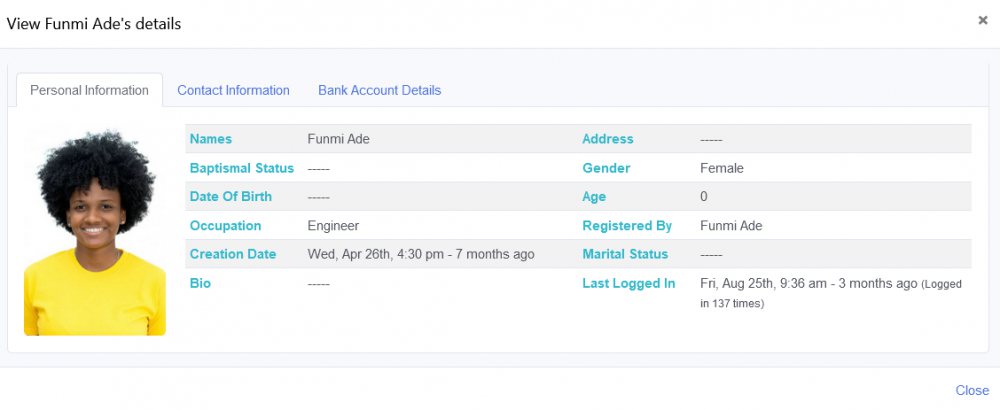 - A dialogue box appears, click Personal Information or Contact Information or Bank Account Details tab to view all the records that belong to a user.